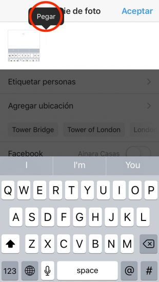 Haz click en Abrir Instagram para enviar tu publicación a la app de Instagram. Ahora te aparecerá una aviso para confirmar que estás en la cuenta correcta de Instagram; este paso es importante, sobre todo, si gestionas múltiples cuentas para diferentes clientes. Una vez en la app de Instagram, selecciona el filtro deseado y recuerda que antes de compartir tendrás que pegar el texto de tu pie de foto; este se ha guardado en el portapapeles de tu dispositivo móvil pero se pegará automáticamente al hacer clic en ‘Pegar’, tal y como aparece en la siguiente imagen: