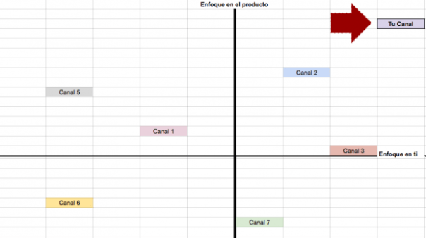 Mapa de posicionamiento para tu nicho Con este mapa vas a tomar 2 características de tu competencia. Por ejemplo, puede ser su estilo cinematográfico, o el enfoque que le dan a sus temas (Audiencia, a sí mismos, o ambos). El tener una representación gráfica de la percepción de otros canales en el nicho te va a permitir identificar espacios con menor competencia. Si realmente quieres crear algo único y con mayor valor de contenido, vas a tener que buscar esos espacios vacíos. Como puedes ver, hacer este mapa es muy sencillo, y lo puedes crear en tu google drive.